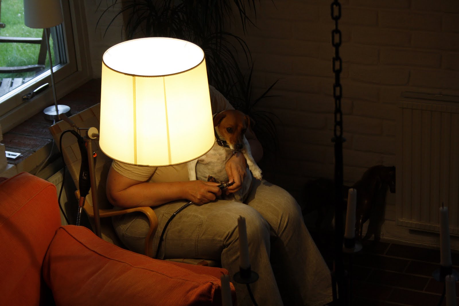 Här ser man hur jag hängt upp maskinen i lampan och bara har sliptrissan med axel i handen.