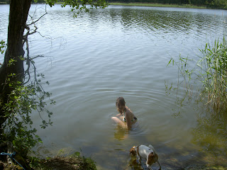I plurret fanns redan retrievern Tessie och vi fick veta att det var 20,5 grader i vattnet. Ingen tvekan att hoppa i, alltså. Jag, Tessie och Tessies lillmatte försökte locka i Kasper. Stor tvekan, men när både hund och matte badade kunde det ju inte vara så illa…