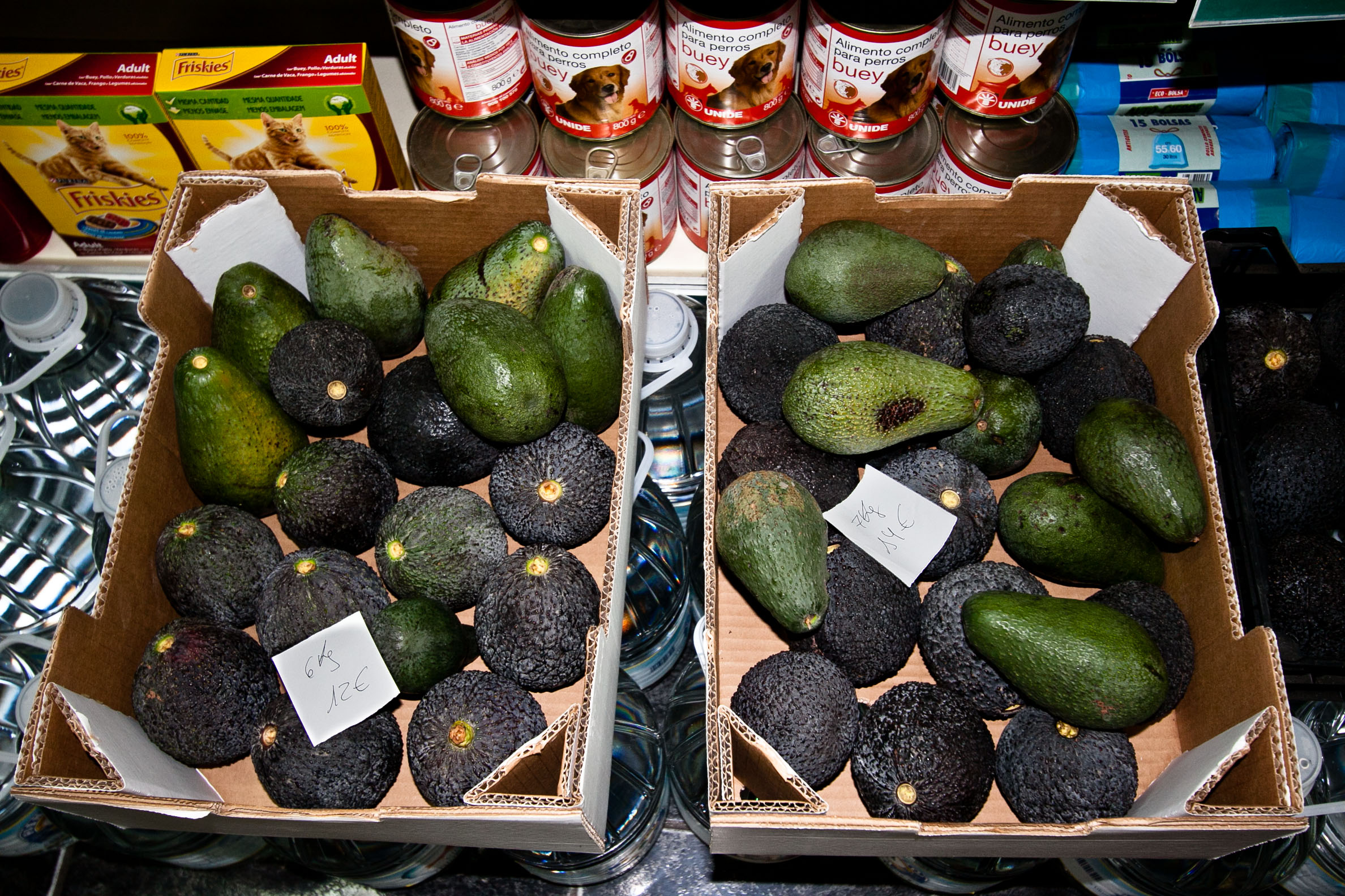 Det är en klar nackdel att bo på hotell med flygresa hem inbokad så man inte kan köpa en sån här låda med de finaste avokador. Den vänstra lådan väger enligt lappen 6 kg och kostar 12 euro, medan man får den högra 7-kiloslådan för 14 euro.