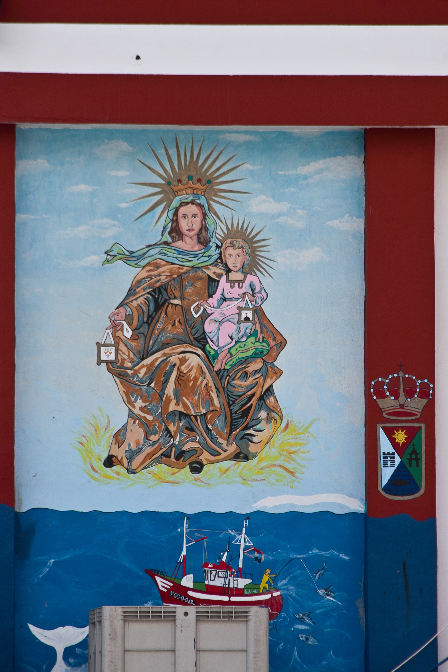 Konstverk? Nja, man kan ha delade åsikter om det. Men någon hade iallafall ansträngt sig att måla denna fiskarnas skyddshelgonsbild på en vägg på piren i Puerto de Mogan.