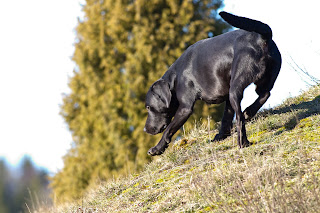 Det sista vi gjorde var ett närsök där jag lade ut fyra mikrodummisar högst uppe på kullen i gräset. Det är ju inte supermycket gräs nu, så särskilt dolda blev de ju inte, men Lakrits stod en bra bit ifrån och såg inte i detalj var jag lade dem.