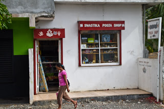 På onsdagsmorgonen väckte Rolf mig. Han hade varit ute och gått en sväng och sade att det var relativt svalt. Vi åt en god bufféfrukost och gick alltså sedan ut på utforskning, valde vägen åt vänster (inåt landet) när vi kom till korsningen. Där kantades vägen av små butiker ”de luxe”, som trots de förpliktigande namnen var ytterst mediokra. Vi gick en bra bit, till nästa korsning och lite åt vänster. När den vägen plötsligt kantades av enbart grönska vände vi åter. Vi köpte en stor vatten och en minipåse nötter för bara 25 rupier i en butik som var aningen större än de övriga (säger inget om storleken).