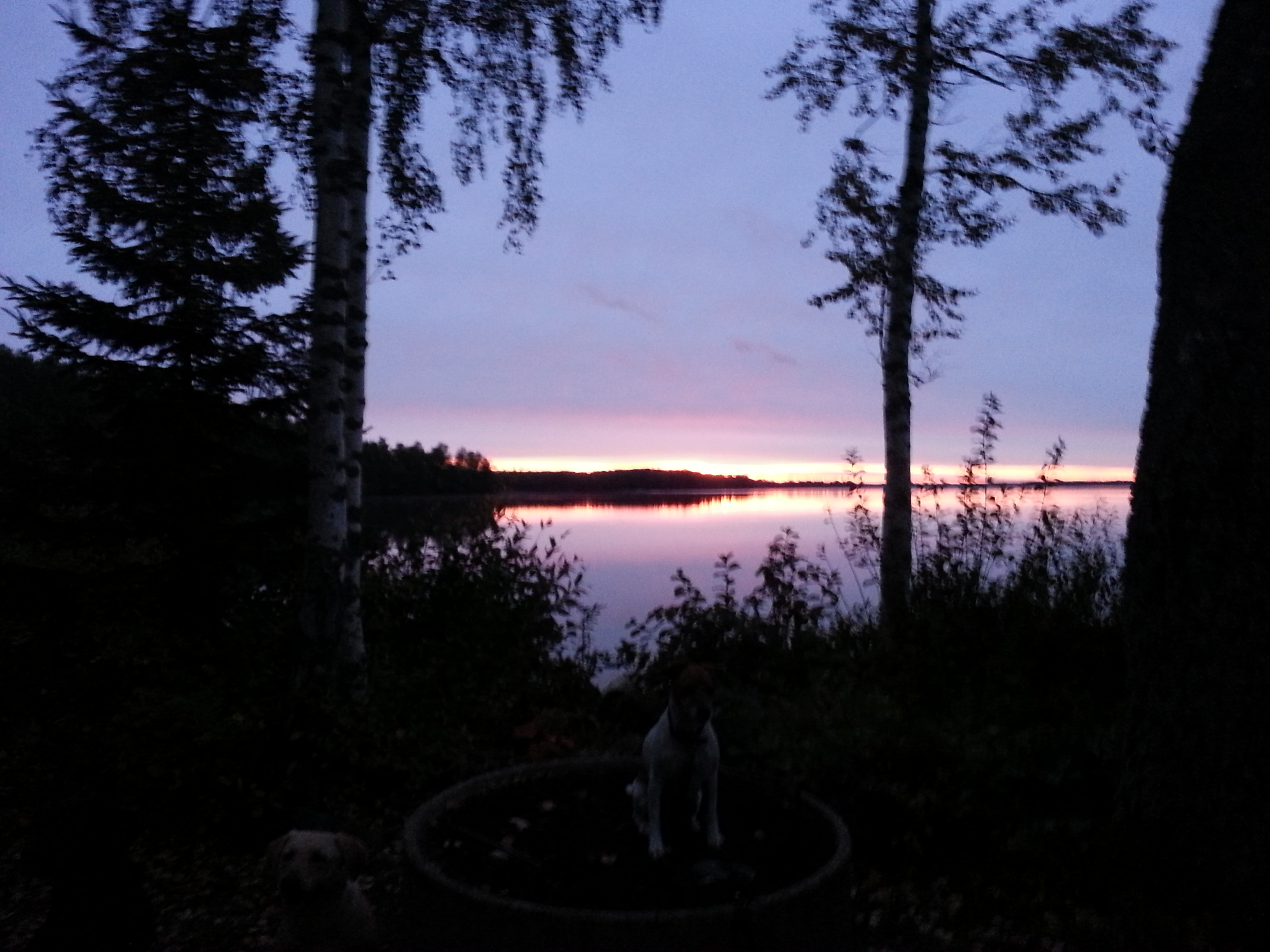 Här är solen på väg ner över sjön. Kasper och Cheysie skymtar i nederkanten.