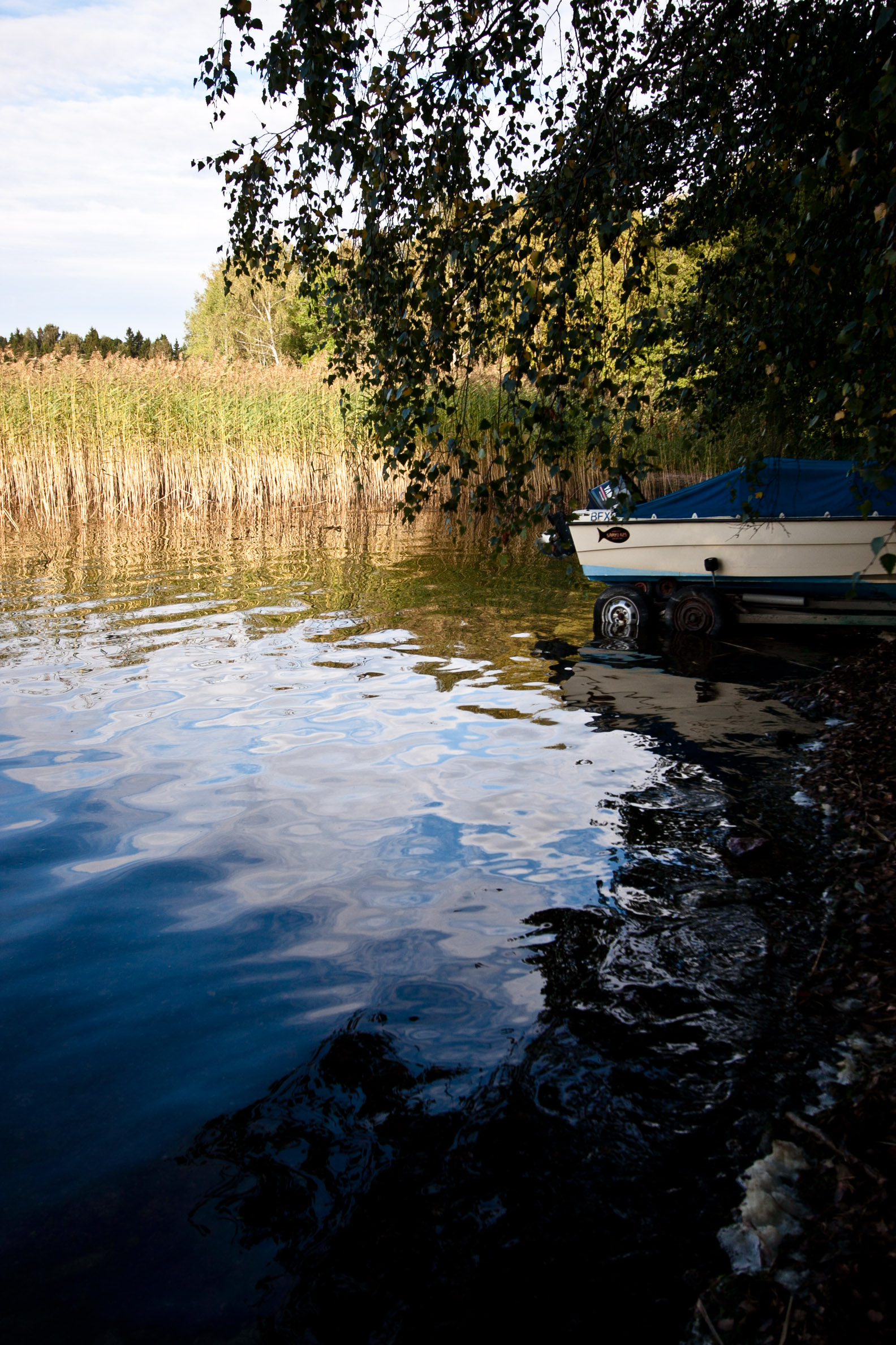 Alldeles blank ligger ytan innanför vassen.