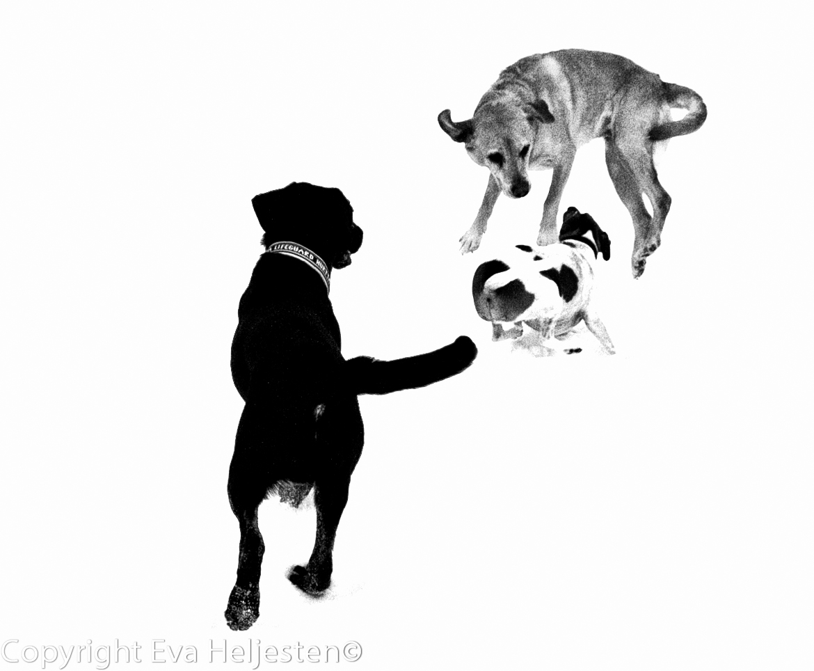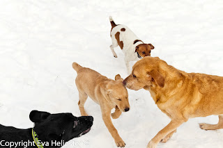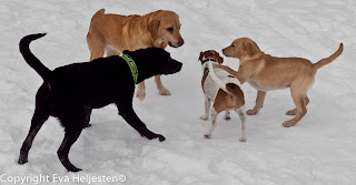 Idag fick vi fint besök av labbarna Alpha och Cheysie samt flatten Tindra. Tanken var dels att låta Kasper och Lakrits få träffa Cheysie, 12 veckor, eftersom hon ska vara hos oss en dag framöver när matte far på annat, och dels att jag skulle få träna stadga och passivitet med Lakrits medan Tindra tränade lite linjetag och sådant.