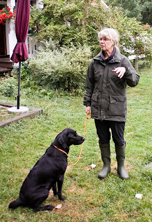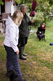 Därefter var det lunchdags. Jag gav Lakrits sin lunch på gräsmattan och sen fick han hoppa in i bilen med tvåbeningarna gick in i huset och fick en jättegod rostbiffsallad. Under kaffet pratade Anita om vikten av passivitet, och hon menar (till skillnad från Carina Persson på valpkursen) att man inte ska belöna passiviteten, eftersom man då bygger en förväntan vilket genererar aktivitet. Hon vill att vi går till något händelselöst ställe och sätter oss med kort koppel och tar tiden på hur lång tid det tar tills hunden har tröttnat och bara kopplar av. Ska bli ett intressant projekt!