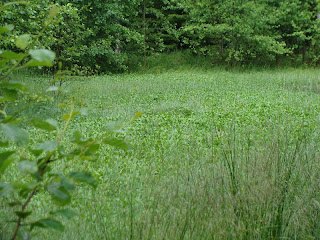 Bumpermarkering över den minst sagt igenvuxna dammen som togs in direkt, sen dirigering till sökområde ute på ängen mot skogen.