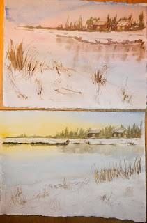 Två vintermotiv med lavering av himmel och vatten.