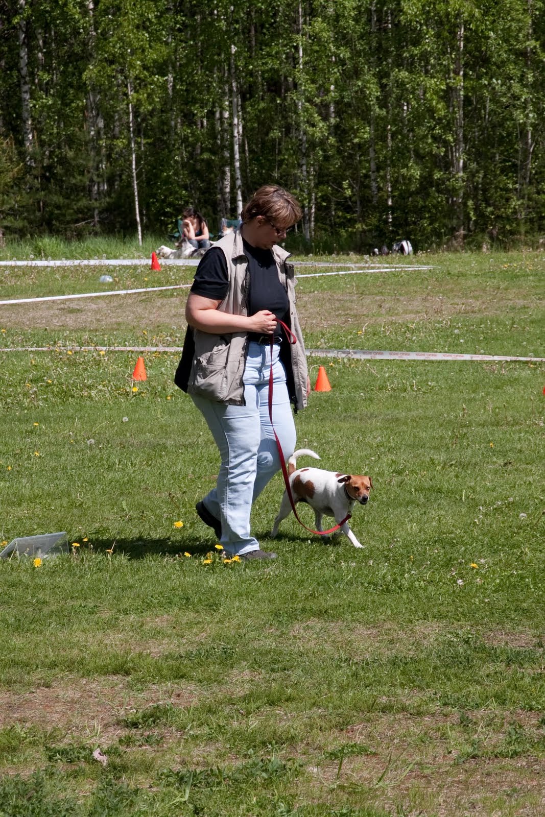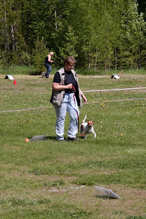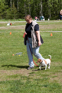 Minns ni att jag sade att Kasper var osedvanligt onosig på generalrepetitionen i torsdags? Nå, idag var han tillbaka i sitt vanliga nosande jag. På ett ställe till och med nosade han på skylten och stack in nosen under den. Jag tänkte att nu välter han den! Men det gjorde han inte som tur var, men det renderade oss tre fel för bristande kontakt. Totalt fick vi fyra sådana nedslag, varav ett säkert var på den allmänt knepiga fläck jag nämnde tidigare. De andra båda är jag mer osäker på. Nosandet generade totalt fem minuspoäng, sen fick vi några andra småfel som ett snett sättande och ett moment där vi tydligen var alltför långt från skylten (det var jag helt omedveten om). Vidare fick vi tre fel för att hunden rörde sig i position, det måste ha varit momentet Sitt + Stå, då han tar ett steg eller två när han ställer sig upp. Det jobbar vi på, men är långt ifrån färdiga med.