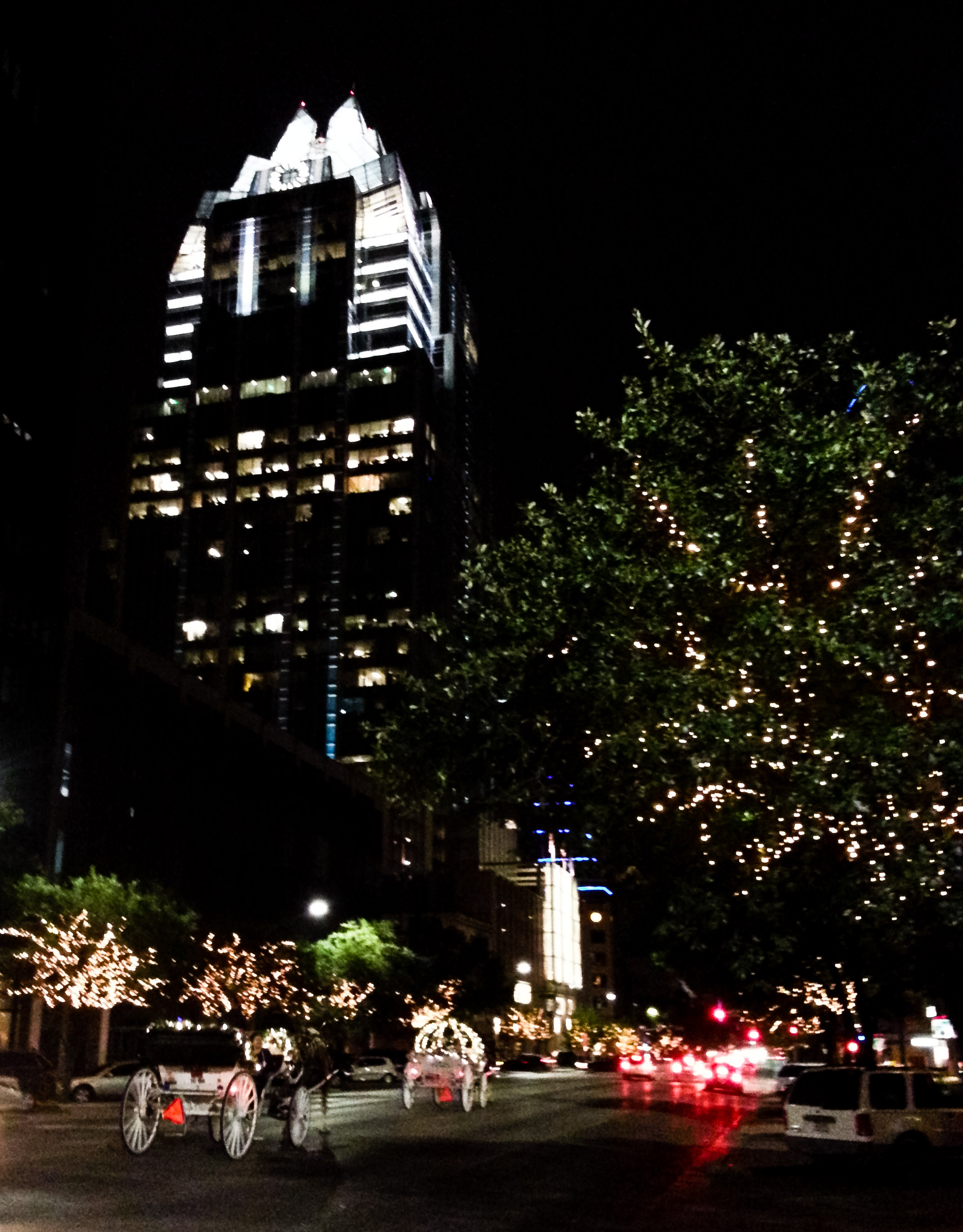 Denna arkitektur är ett av Austins kännemärken när man kör runt i stan. Här på Congress som redan pyntat träden med ljus och där turistdroskorna duggar tätt.