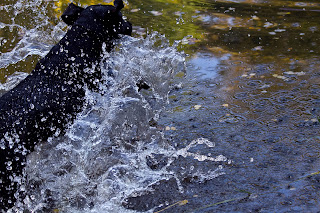 Om jag nu minns alla turer rätt, så var han därefter i vattnet en sväng utan att ta in något. Anita, som visste var hon kastat i fåglarna, menade att han var i precis rätt vassområde för en and. Istället sprang han upp på land igen och nosade vid en granhög. Där ratade han så en kråka … Tillbaka ner i vattnet och tog in en and.