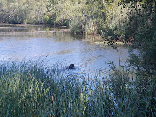 Vi stod på plats när Annika kastade ner i vassen, så jag skickade honom på första. Sedan kastade hon i en eller två till medan han simmade, men han hade full fokus på den första, som snart kom in i hand. Det var min lila kastapport. Nu fanns det 8 röda kvar. Jag vände runt honom ett kort varv och vände upp mot vattnet igen. Han ville inte i, men jag tog i med bestämd (inte arg) röst. Du ska i och jag vet att det finns en apport därborta! Efter lite trilskande gjorde han faktiskt som jag sade! Jag peppade tills han var utanför vassområdet (ganska tätt och lätt att fastna i) och sen lossnade det. Han visste som av sig själv att han skulle simma ut till vassen på motsatta sidan. När han var nästan framme såg jag en röd apport som flöt aningen utanför vassen, så jag dirigerade Höger, och ta mig tusan om han inte sam rätt på den! Mycket bra avslut där, alltså.