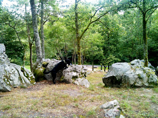 Jag jobbade någon timme och efter lunch och lite tvätthängning tog vi cyklar och hundar och åkte bort till jävulsstenarna. La Roche au Diable, som enligt wikipedia är en cromlech (bretonsk stenring) som alltså är unik för regionen. Nog för att stenarna var lite cirkelformade, men inte alls så där uppresta och raka som mer kända stenringar. Men ett prima ställe för oss: