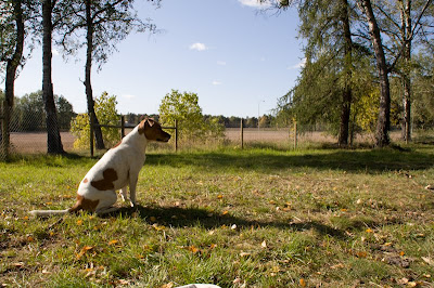 Tja, i vilket fall är han idag betydligt piggare än husse och matte. För att låta honom springa av sig lite tog vi en tur med bilen i det vackra höstvädret till en hundrastplats i Rosersberg. En hund gick just därifrån när vi kom, så vi fick vara ensamma. Bra, för den händelse han nu har kennelhosta…