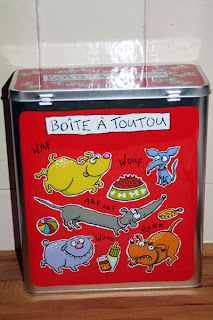 Jag har handlat några saker, fast det känns lite svårt innan man har valpen på plats. Men ett litet mjukt halsband, en något större sele och matchande koppel hittade vi i Paris, liksom någon leksak. Där hittade vi också en urfin plåtlåda att ha något kilo hundmat i, den gör sig redan fint i köket.