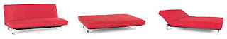 Dock inte röd, för röda soffor har vi redan två. Den här blir istället mörkgrå med ett diskret bambumönster i ännu mörkare grått. Den var riktigt skön att ligga i, så hoppas den blir bra för framtida sovgäster. Som synes på bilden är den mycket flexibel. Lär anlända om nån månad eller så.