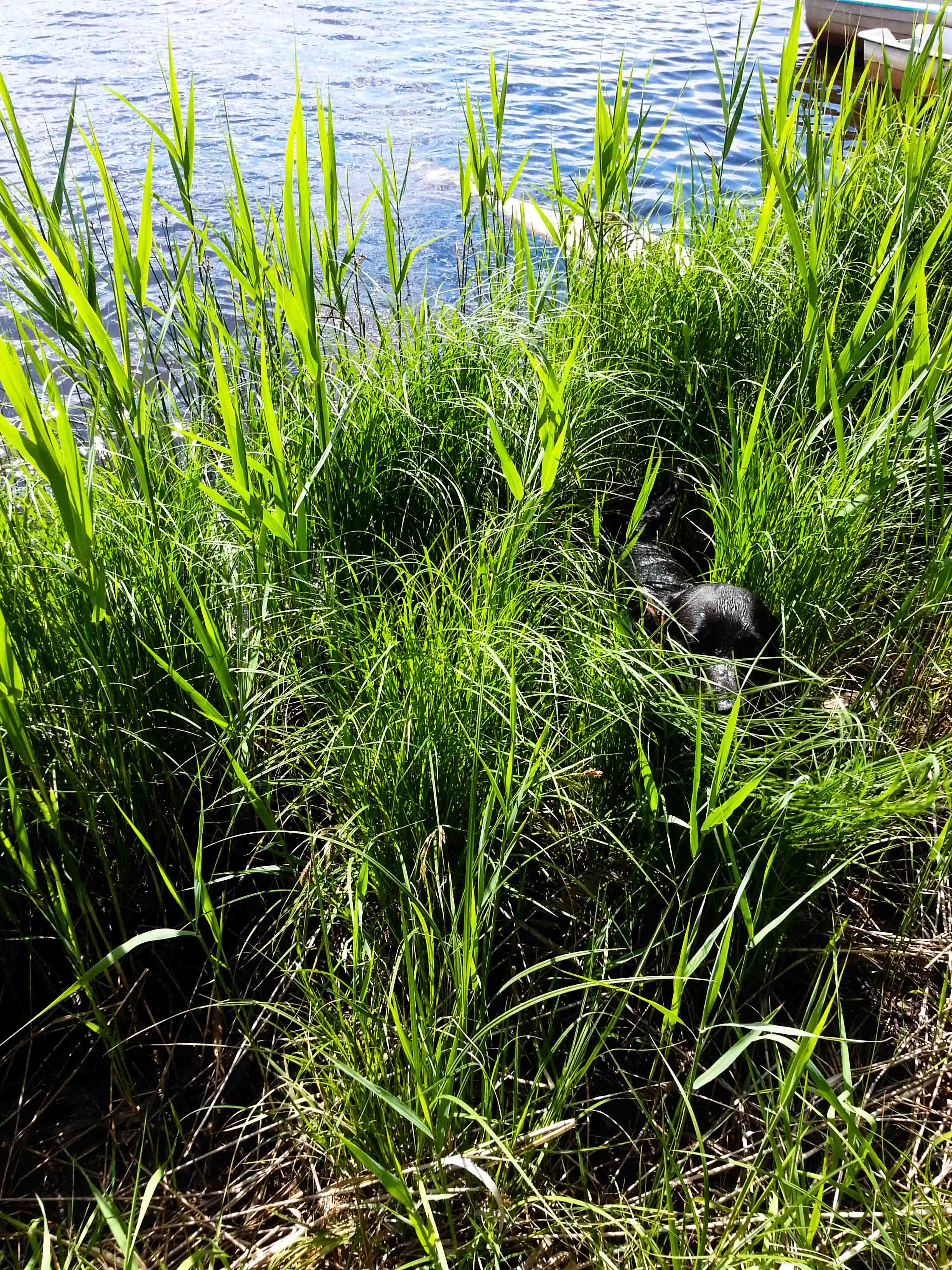 Lakrits är halvvägs upp från vattnet i den höga vegetationen.