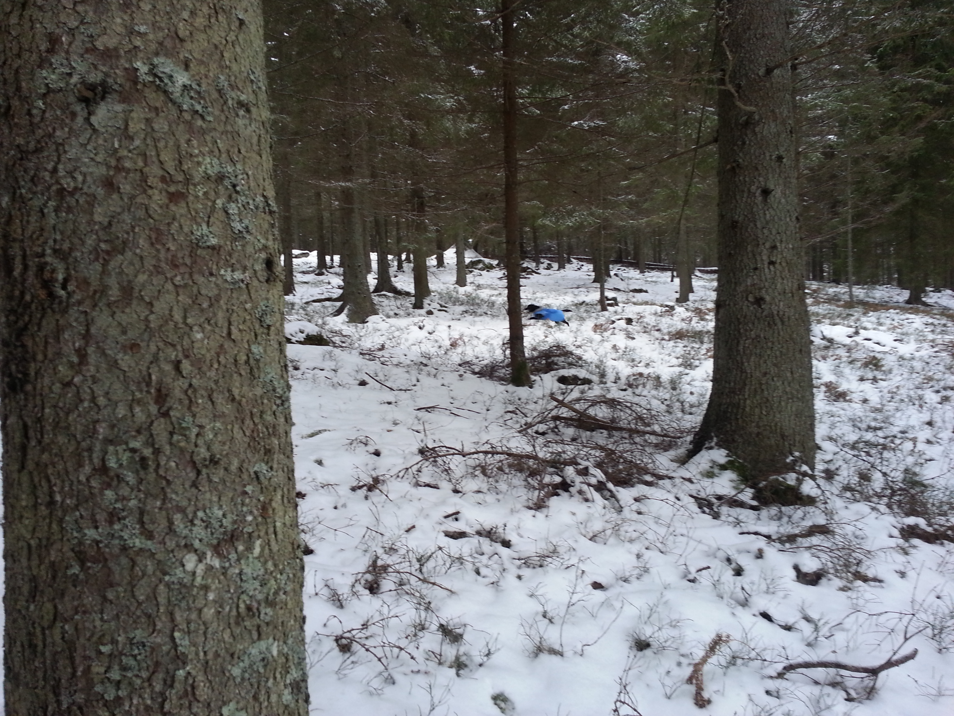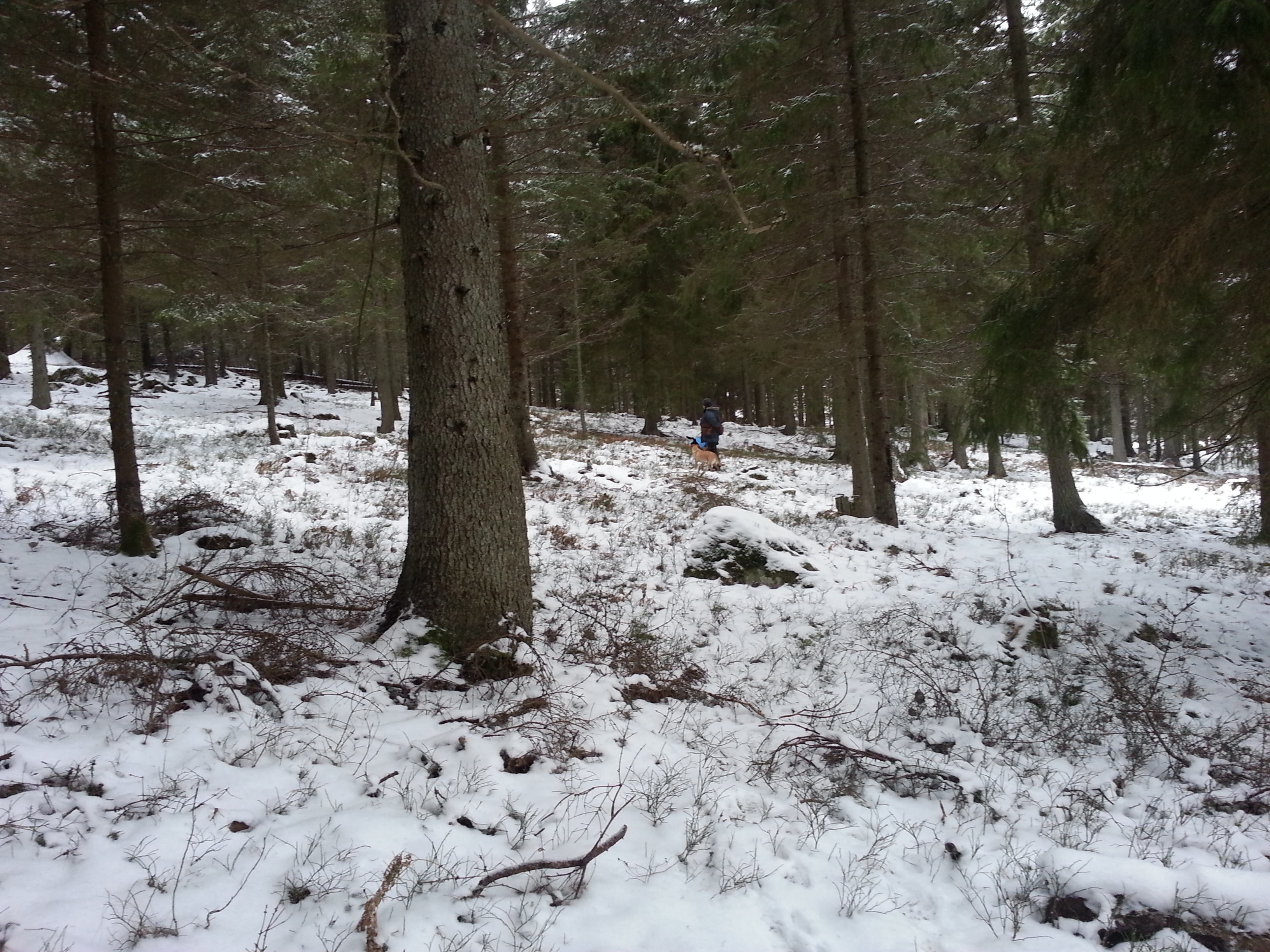 Vi återvände till dirigeringssidan av timmervägen och körde varsitt skick i turordning. Eftersom vi var fyra och hade fem ställen med fyra apporter vid varje blev det väldigt bra att gå laget runt och följa solfjäderns form från höger till vänster. Då fick man automatiskt ett nytt ställe vid varje ny runda och till slut hade alla betat av alla platserna. Det var relativt långa avstånd och inte jättelångt mellan varje ställe, så det gällde att vara beredd om hunden gick ur spår för mycket så inte fel apport hämtades in.