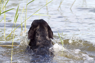 Han var ju inte så kaxig att simma förra gången vi var här, så Anita kastade en kort markering från båten. Som tur var hade han ju träningssimmat lite igår med sin nyfunne sparringpartner i Slagsta, så han hämtade in den kastade anden utan problem.
