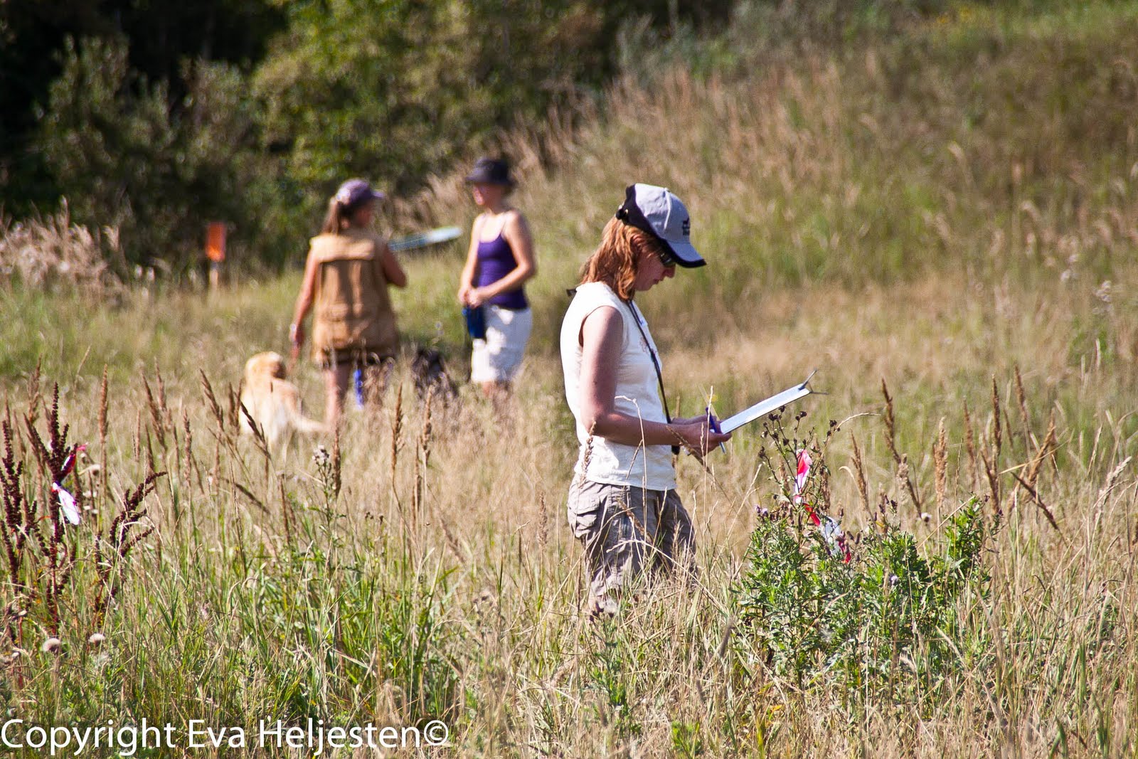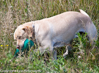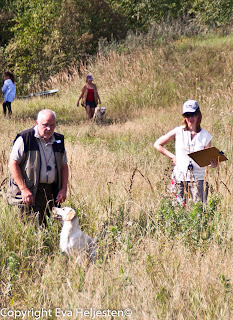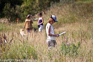 Det var riktigt kul att se hur olika hundar och förare betedde sig. Beroende på hur ny eller erfaren man var kunde man välja mellan att få en, två eller tre markeringar kastade åt sig. Det var bara ett fåtal som valde en, flertalet valde två och en bunt valde tre. Tre var klart svårast, eftersom nummer två och tre kastades på en linje efter varandra (sett ur hundens synvinkel) och många fastnade på första stället istället för att söka sig vidare ut efter nästa. Det stod också mycket tydligt att värmen gjorde sitt, för den sista timmens ekipage (oavsett erfarenhetsgrad) betedde sig klart vimsigare och glömde koppla på nosen, jämfört med de ekipage vi såg i början av tävlingen.