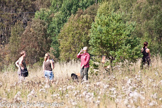 Jag utsågs till markeringskastare vid en av de fyra stationerna. Det innebar att stå mitt på ett solgassigt fält med högt gräs och vassa tistlar, så jag var rätt nöjd med mitt klädval. En stor flaska vatten (som jag även kunde skvätta över huvudet) och ryggsäckspallen där jag kunde slå mig ner i pauserna gjorde livet uthärdligt.