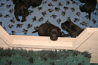 Idag rapporterar kennelmamman om att det är Stora Utdrullningsdagen, det vill säga dagen då de små för första gången lyckades kravla sig över kanten till valplådan ut i stora världen. Mamma Guinness bidrog stort till detta genom att lägga sig strategiskt utanför lådan och locka med sina mjölkstinna juver. Stjäl i vanlig ordning lite bildbevis på detta historiska ögonblick: