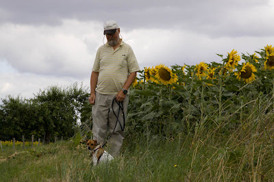 Några vilsekomna solrosor i vetefältet. Har de månne marscherat dit ända därbortifrån? De ser ut som ståtliga fågelskrämmor där de står…