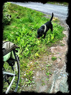 Det gick iallafall riktigt bra, med ett antal små kisspauser, två vattenpauser och en gräsätarpaus när jag packade undan den för varma jackan. Mot slutet var han trött, så de sista km tog vi i ett långsammare tempo mer värdigt en gårdshund. Det tar ett tag innan man lärt sig hushålla med energin som cykelhund.